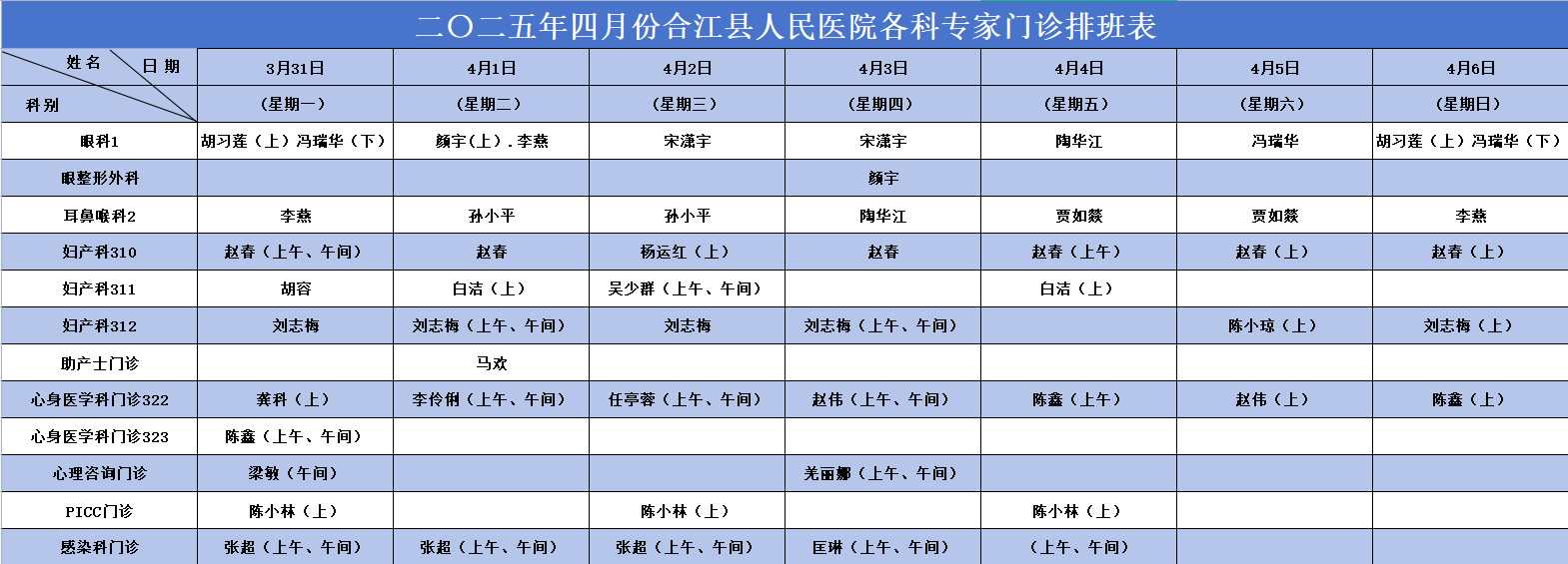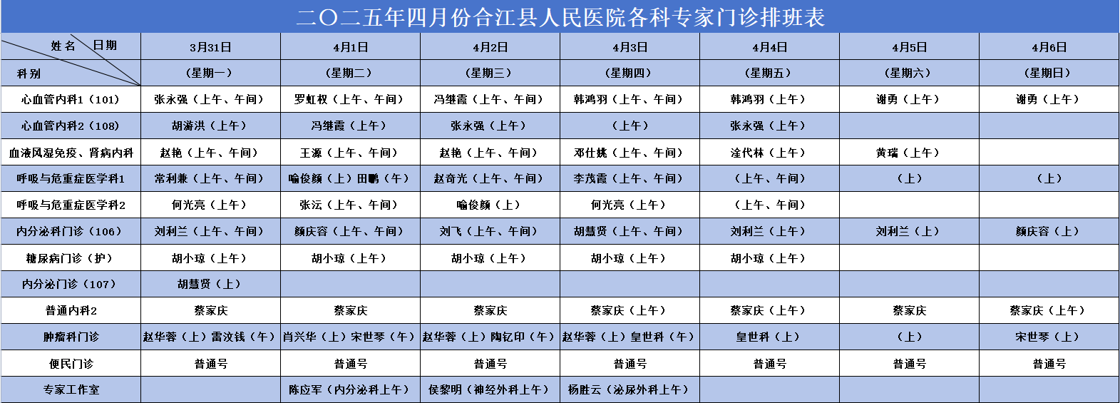 二〇二五年四月份合江县人民医院各科专家门诊排班表