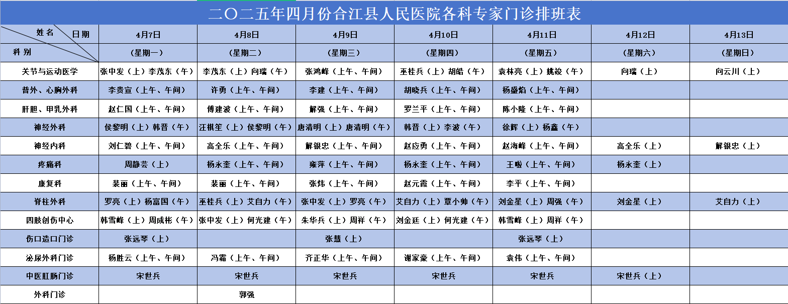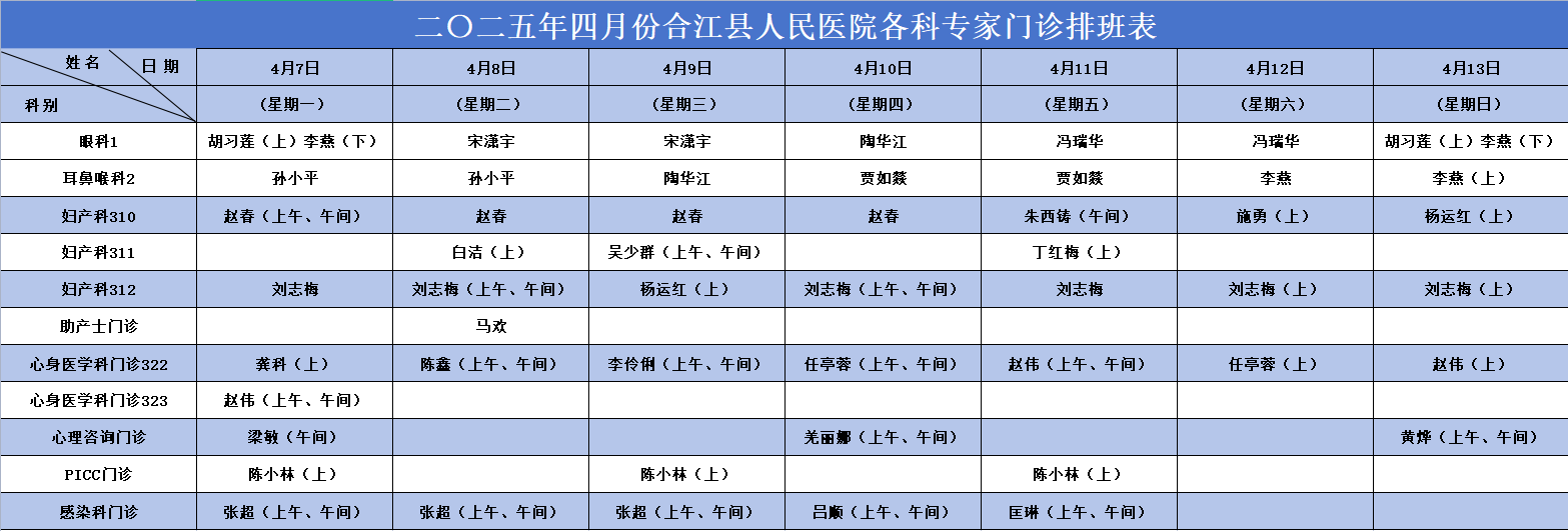 合江县人民医院2025.04.07-2025.04.13各科专家门诊排班表