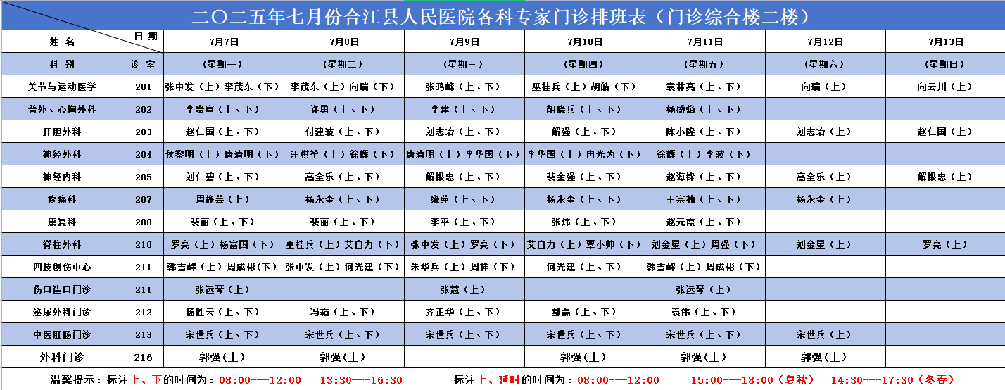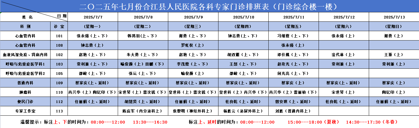 合江县人民医院2025.07.07-2025.07.13各科专家门诊排班表