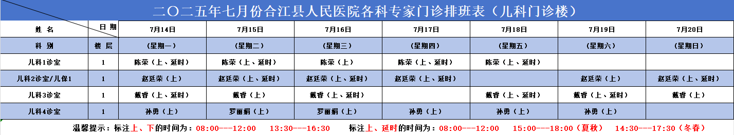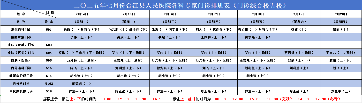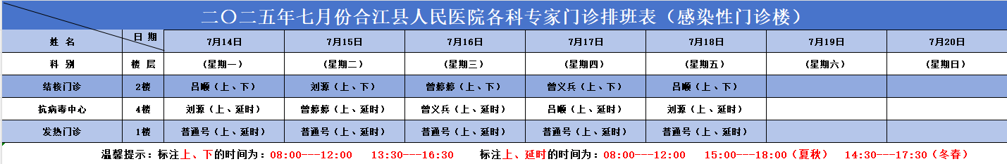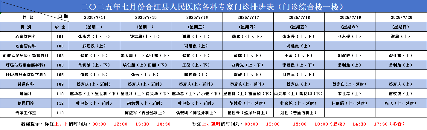 合江县人民医院2025.07.14-2025.07.20各科专家门诊排班表