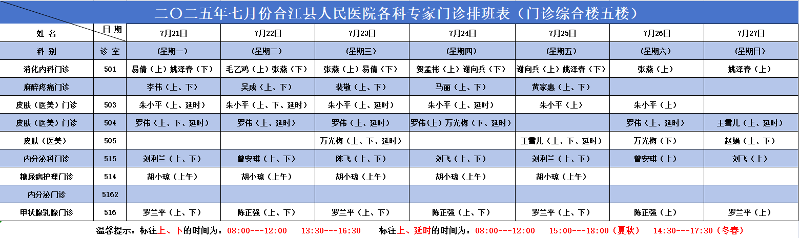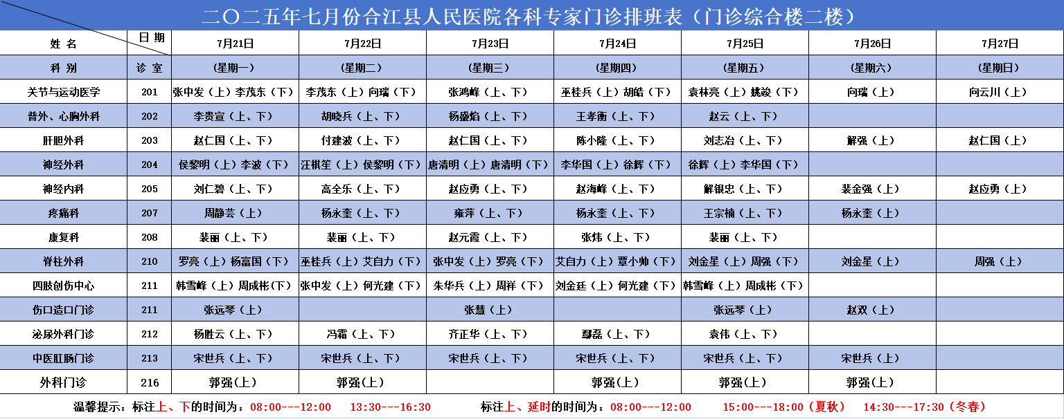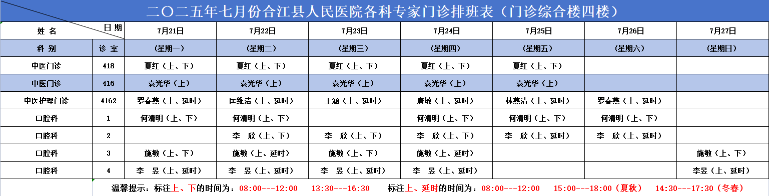 合江县人民医院2025.07.21-2025.07.27各科专家门诊排班表