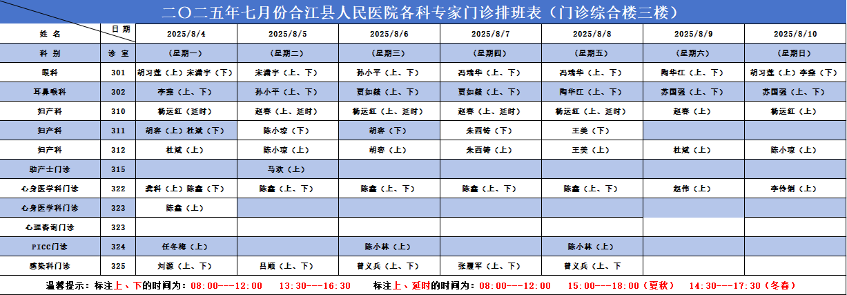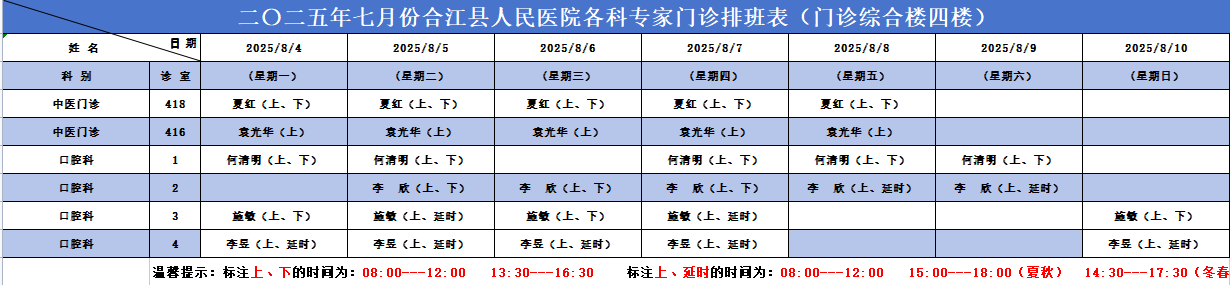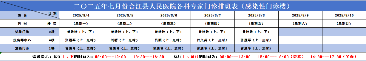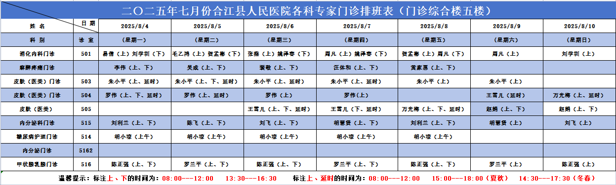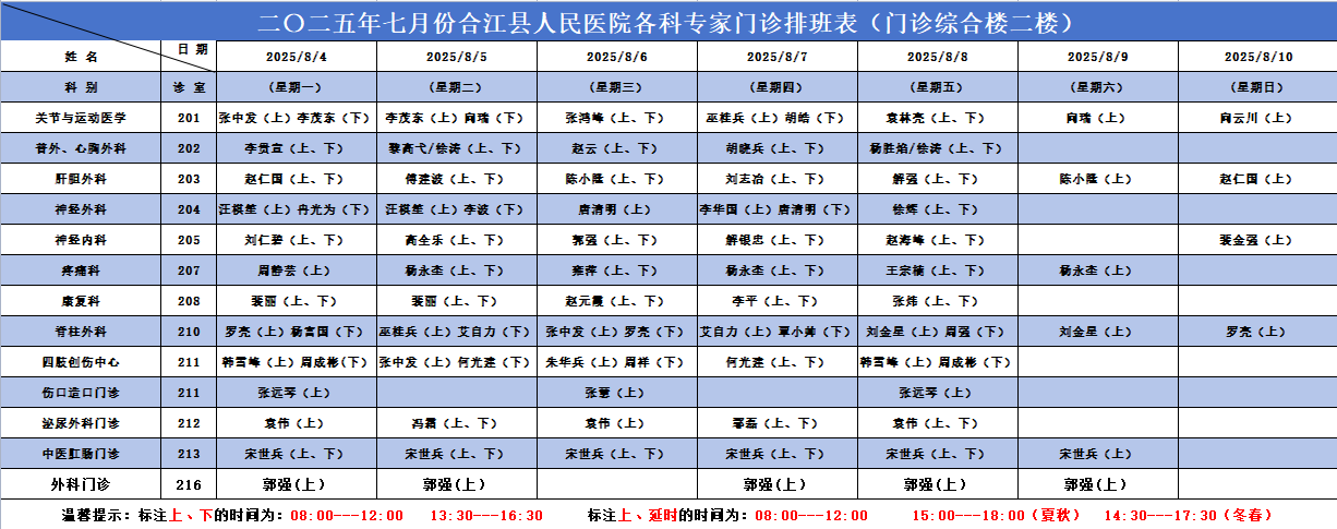 合江县人民医院2025.08.04-2025.08.10各科专家门诊排班表