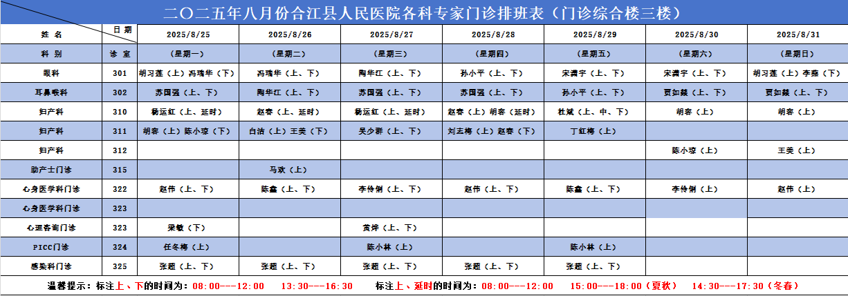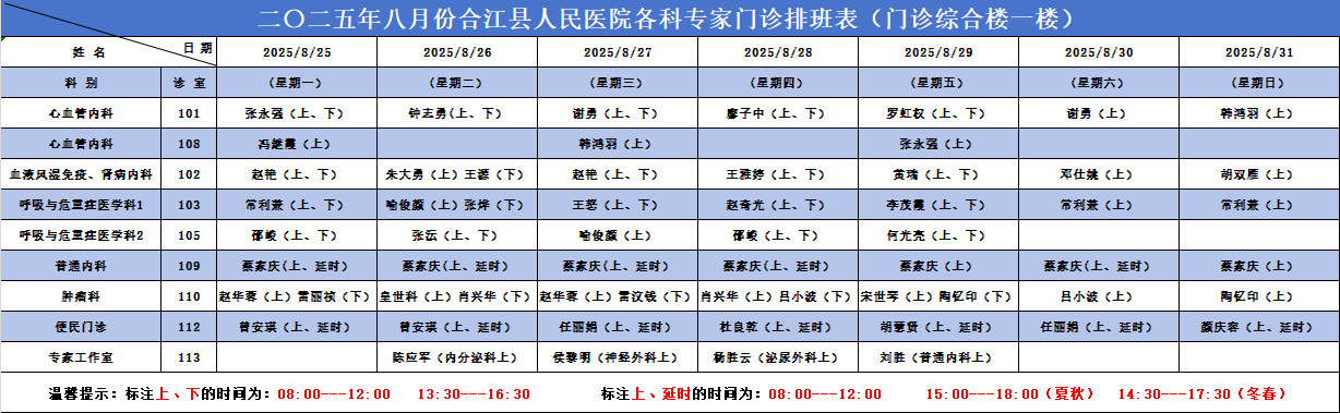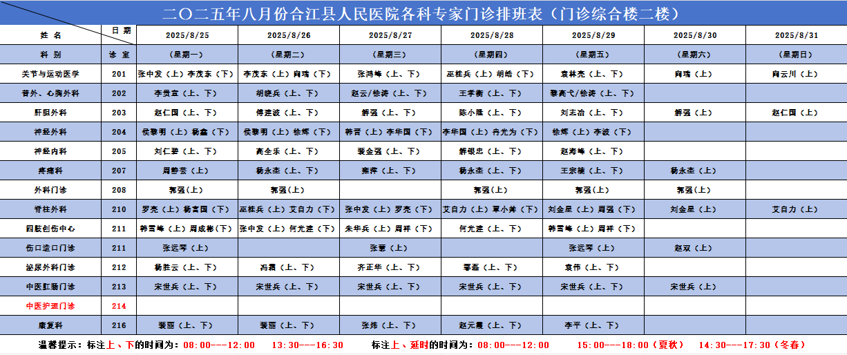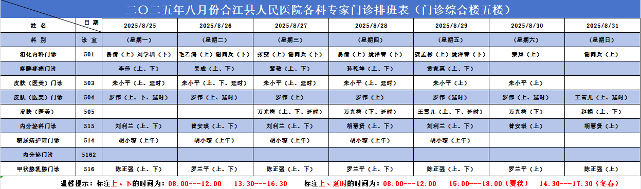 合江县人民医院2025.08.25-2025.08.31各科专家门诊排班表