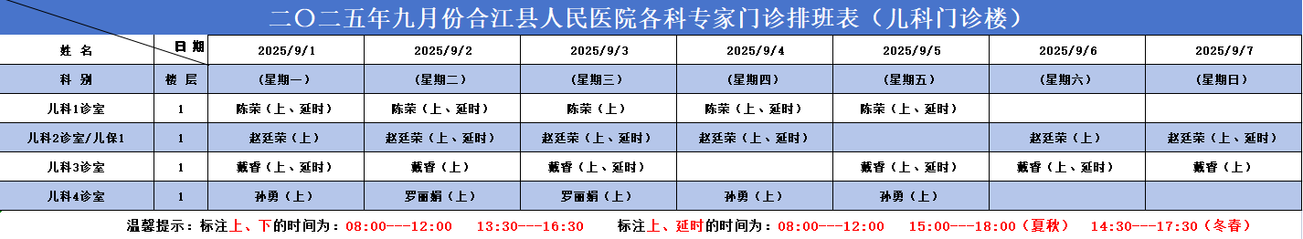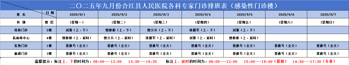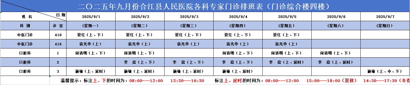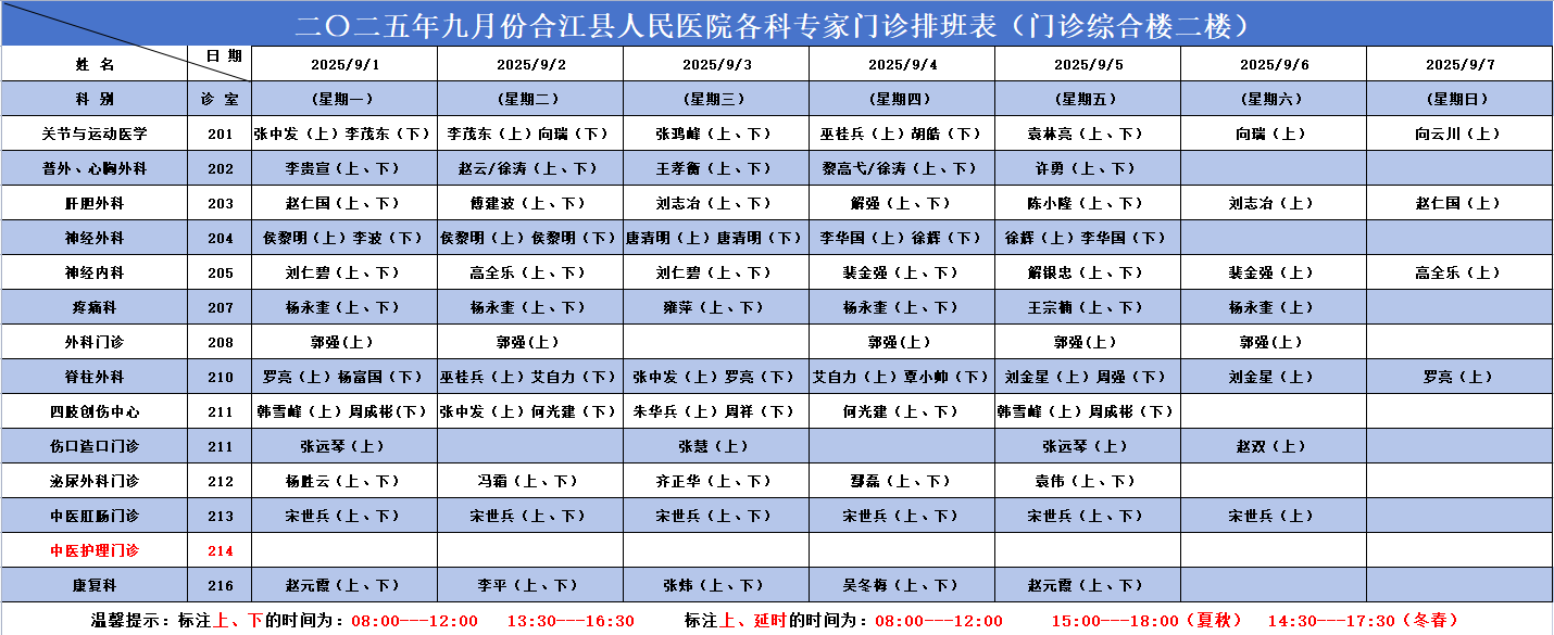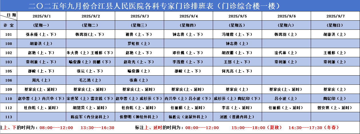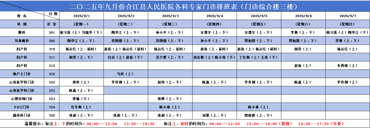合江县人民医院2025.09.01-2025.09.07各科专家门诊排班表