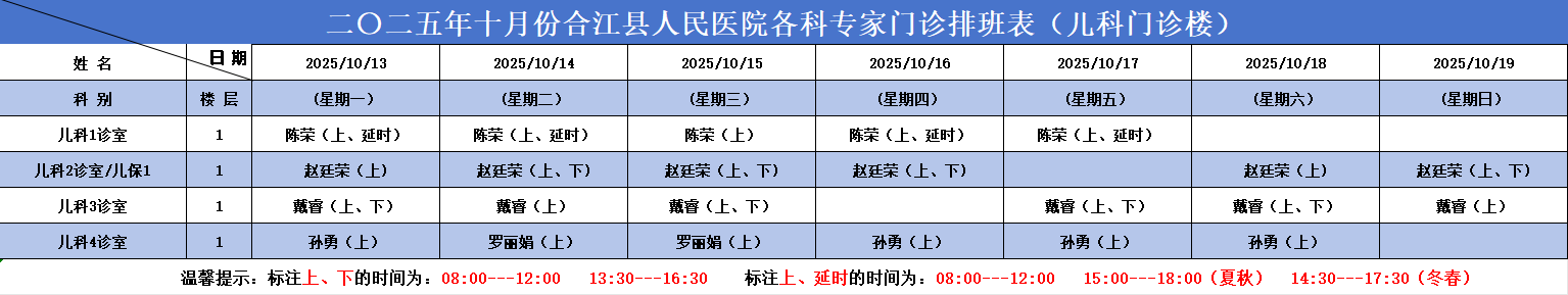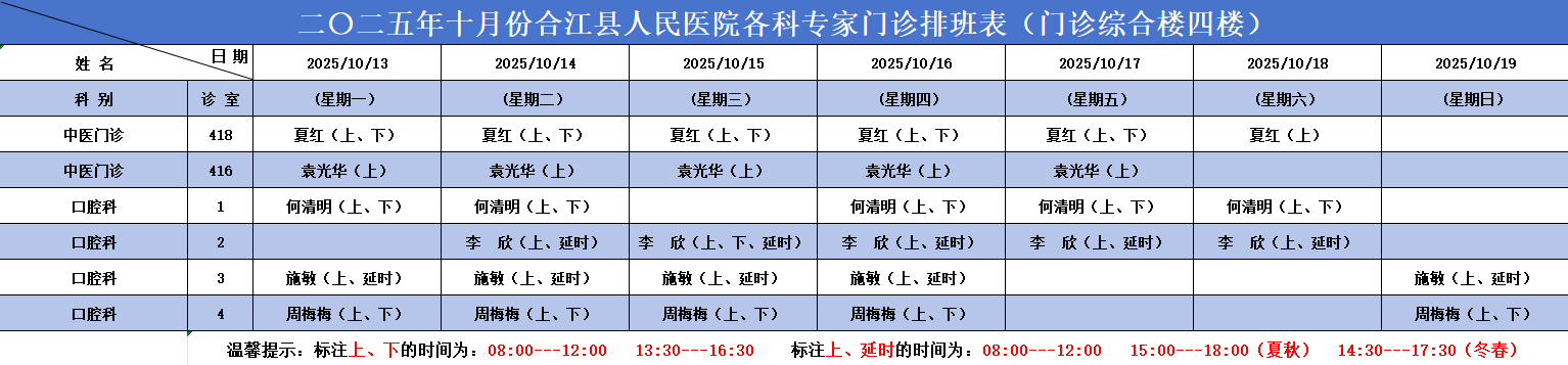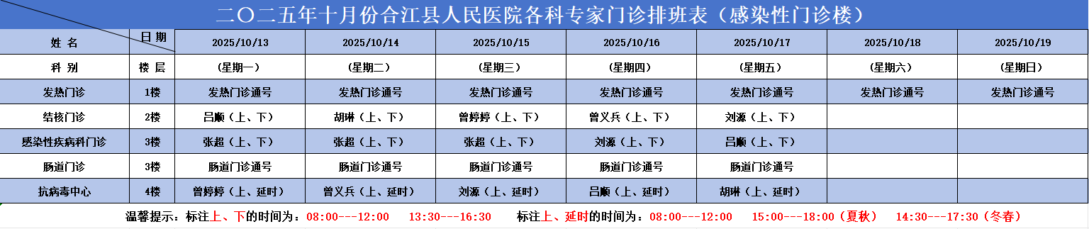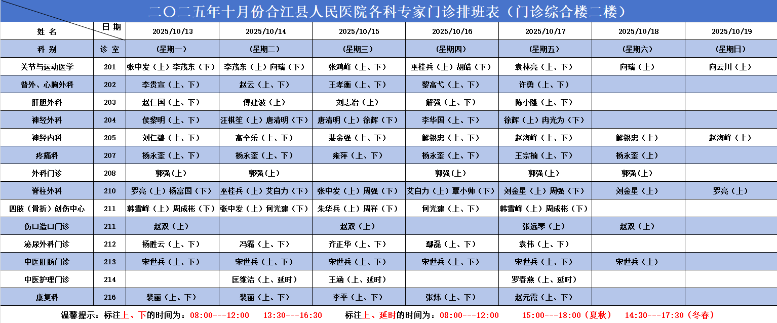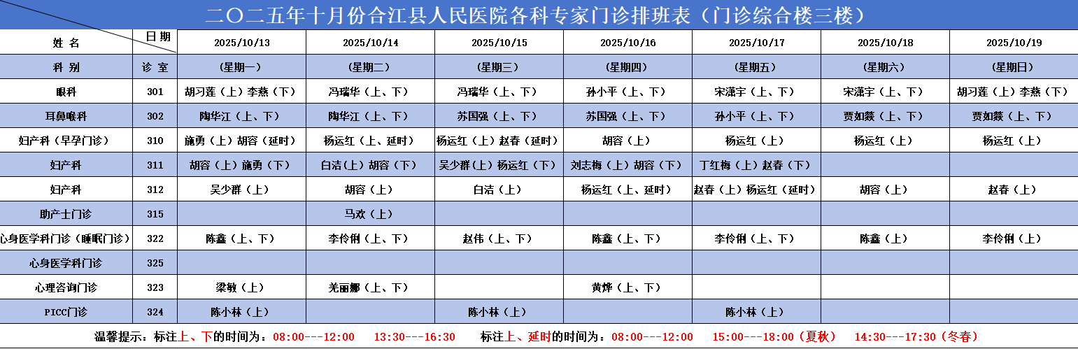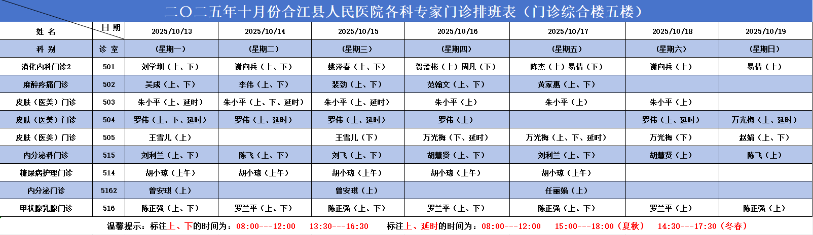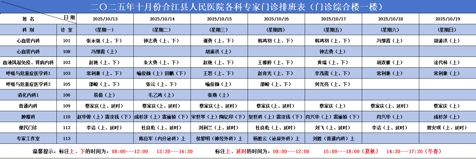 合江县人民医院2025.10.13-2025.10.19各科专家门诊排班表