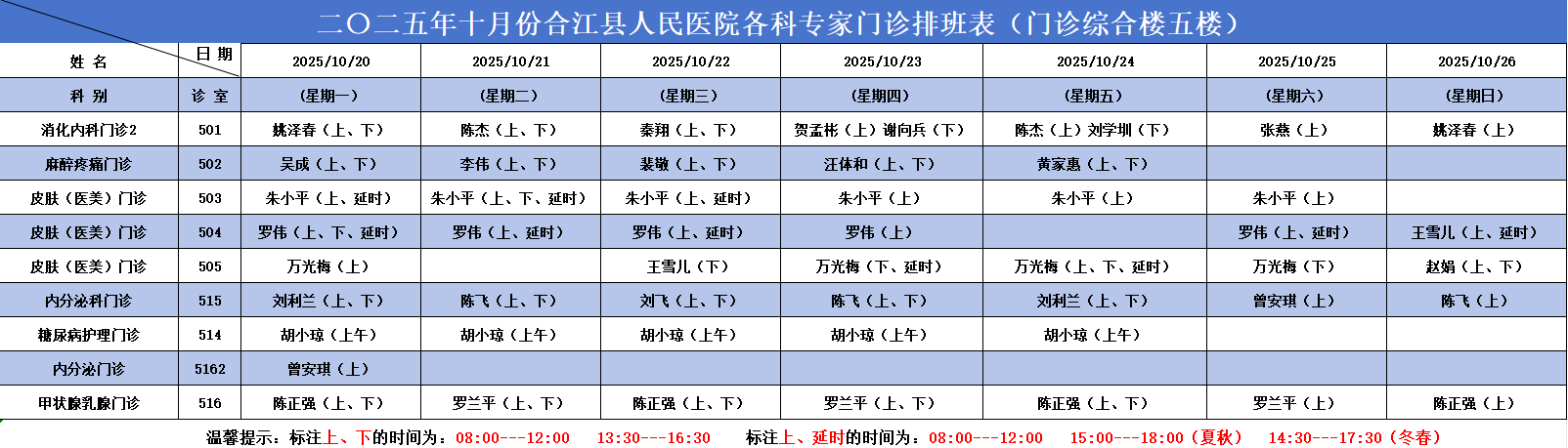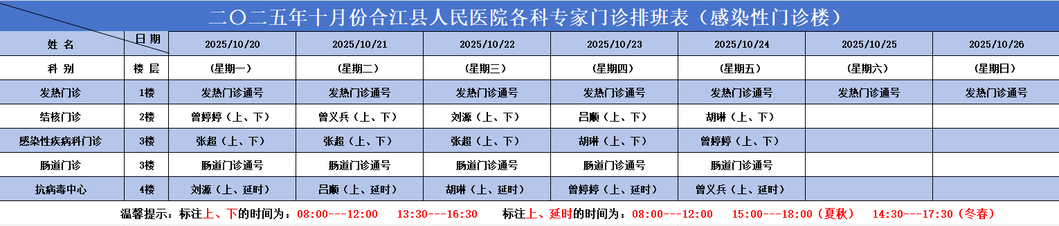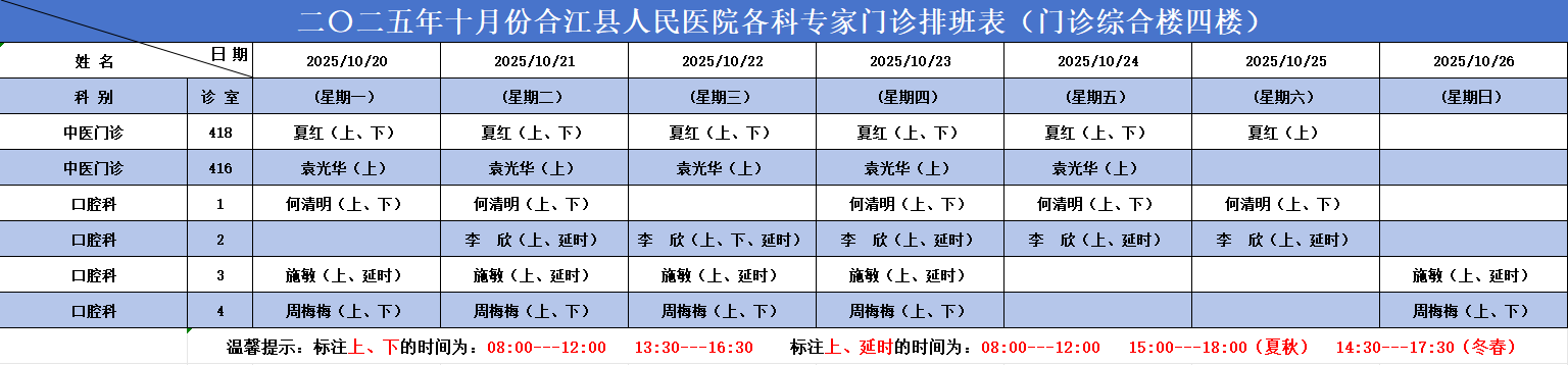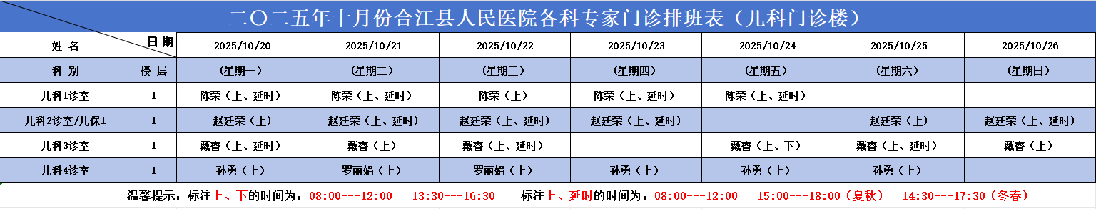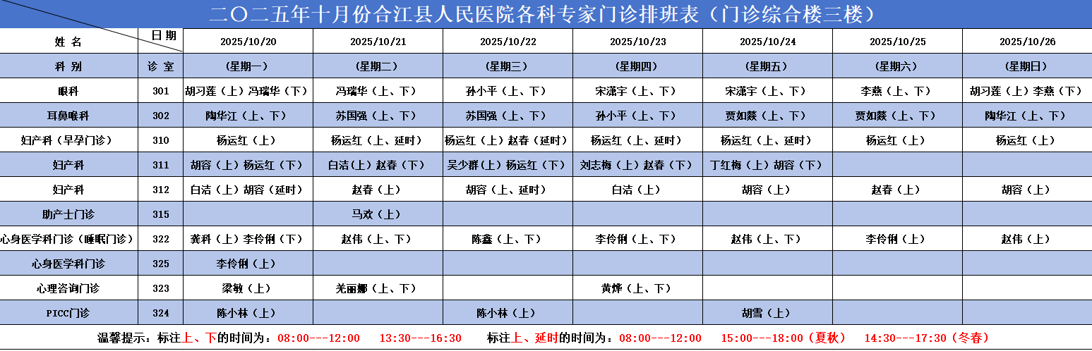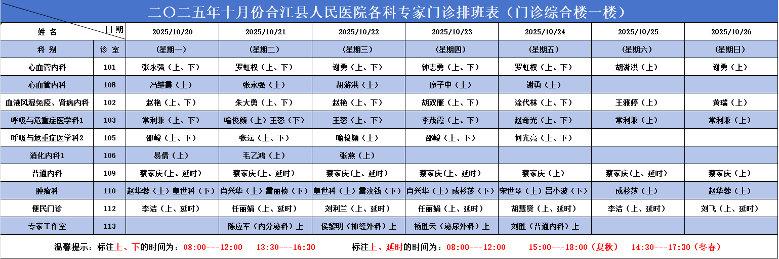 合江县人民医院2025.10.20-2025.10.26各科专家门诊排班表