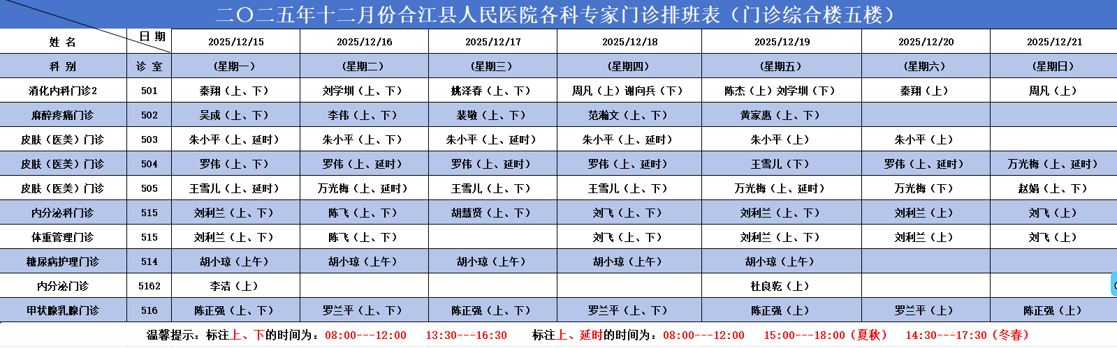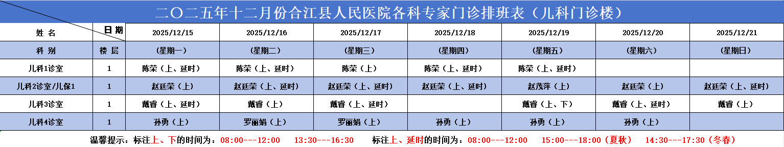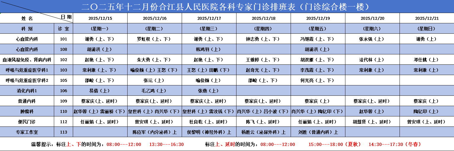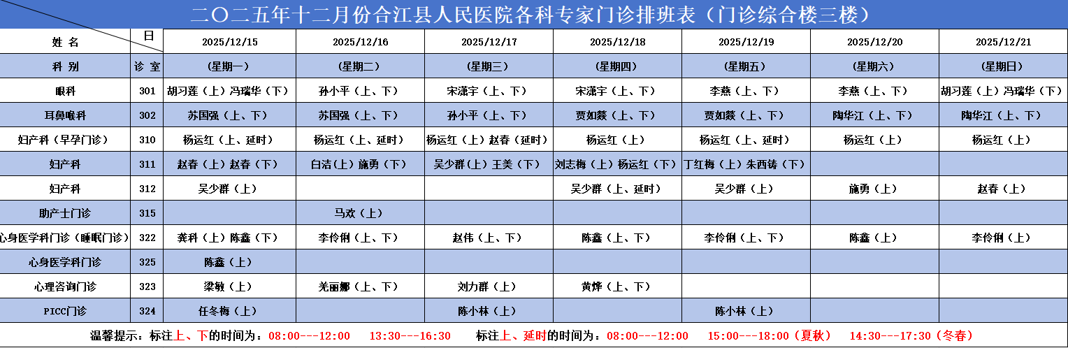 合江县人民医院2025.12.15-2025.12.21各科专家门诊排班表